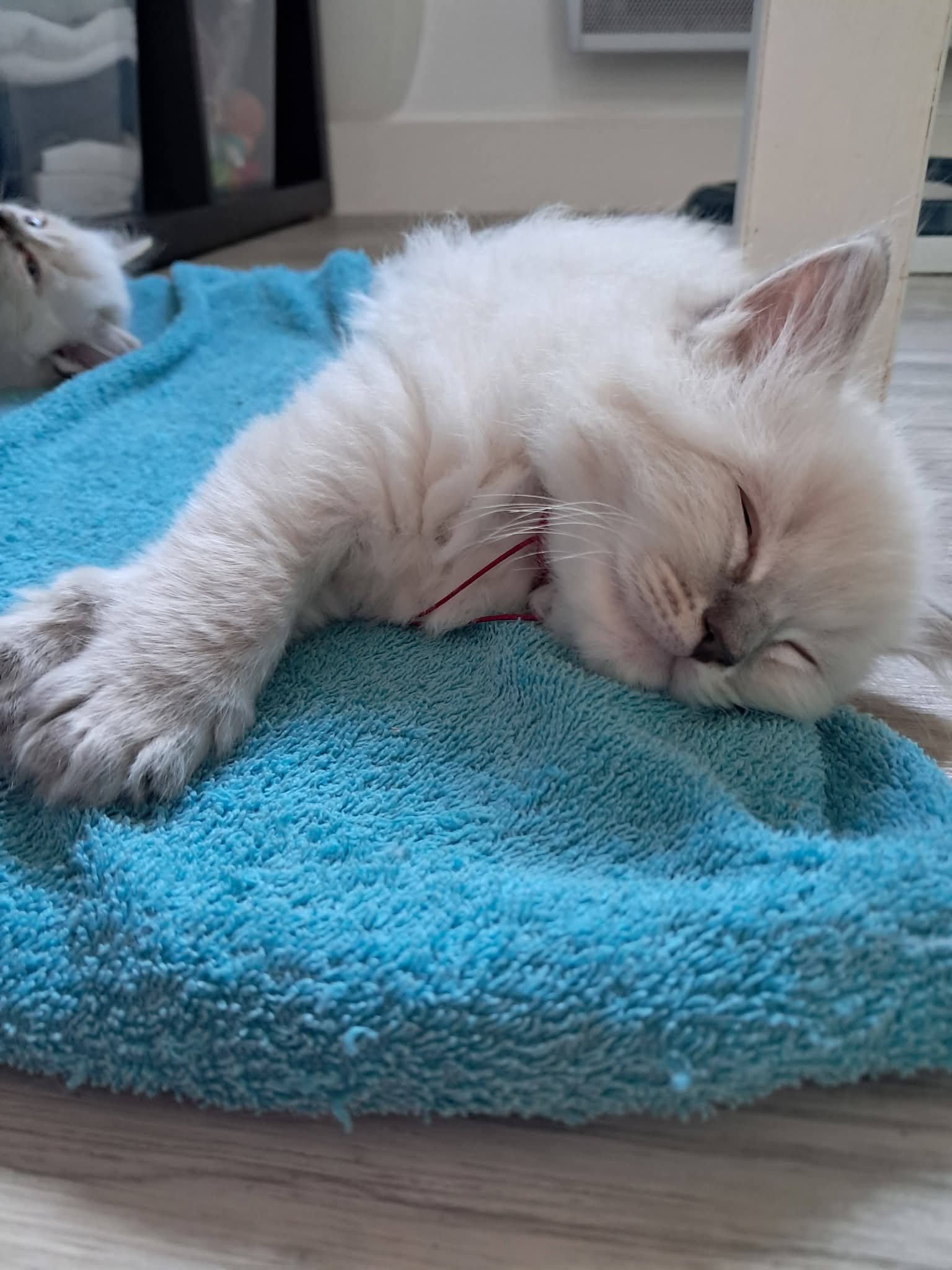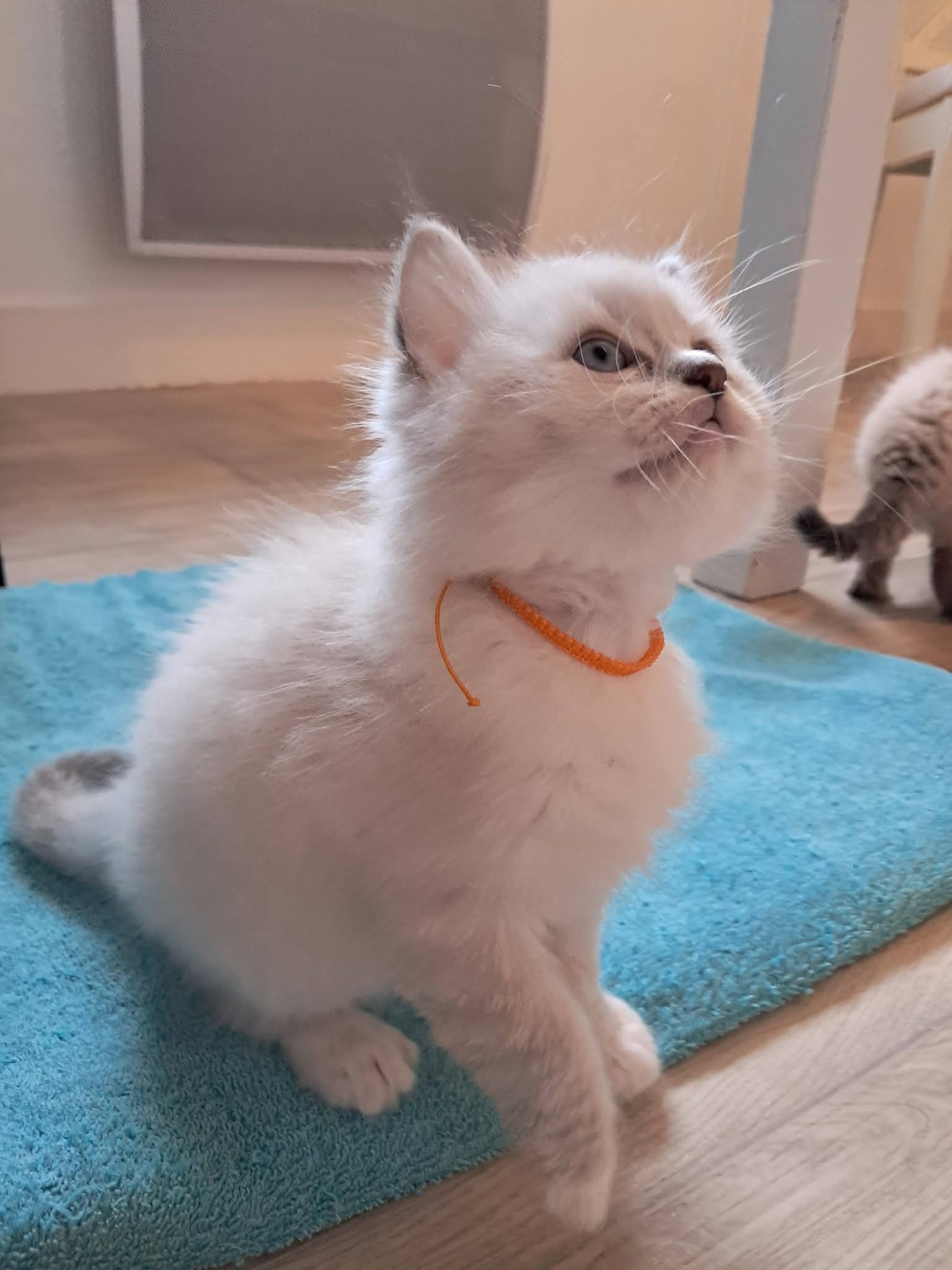 Je suis Blue Tabby point, donc pas de chaussette blanche comme mon frère et j'ai une bouille plus ronde comme mon papa.